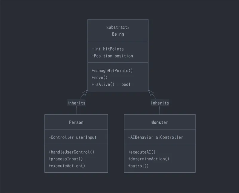 First, some aspects of OOP feel counterintuitive. A key feature of classes in OOP is the ability to create abstractions, that is, to define a "genealogy" of inheritance from more generic to more specific classes. For example, in a videogame where players battle monsters, the class Person may be defined as the "child" of a more abstract class called Being, which is also the parent of the Monster class. Being would be used to define all of the traits in common between all children, like the management of their hit points, their ability to move, etc. The sibling concrete classes Person and Monster, on the other hand, would each define characteristics specific to themselves only—the handling of user control for Person objects, for example, and autonomous AI behavior in the Monster objects.